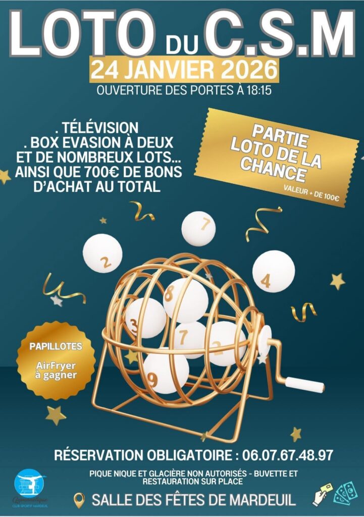 Commune de MardeuilL’AGENDAÉVÈNEMENT Loto CSM 24 Jan 202618:15 Salle des fêtes rue de la Liberté De nombreux lots à gagner, des bons d’achat Réservation obligatoire au 06 07 67 48 97