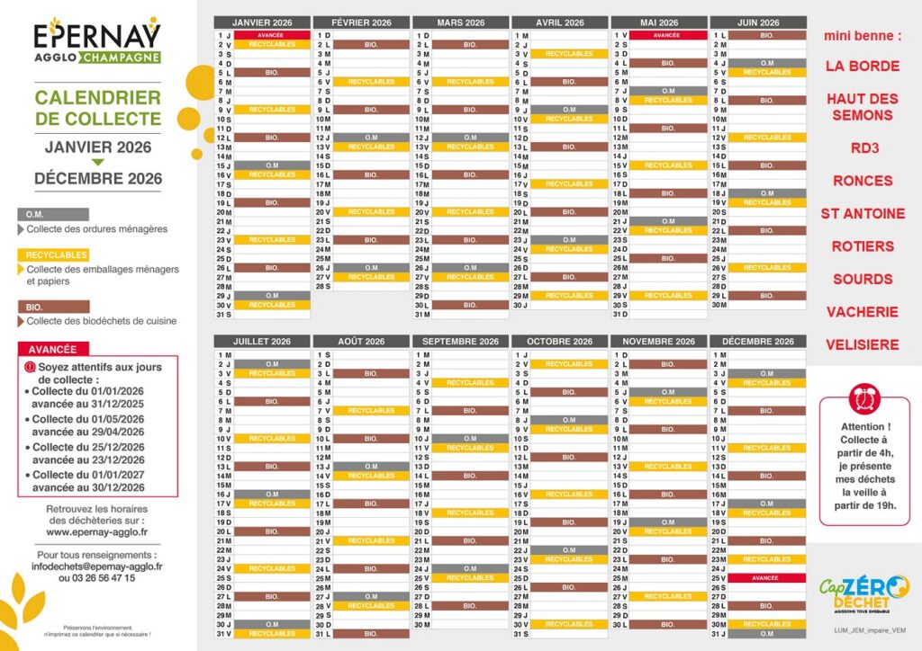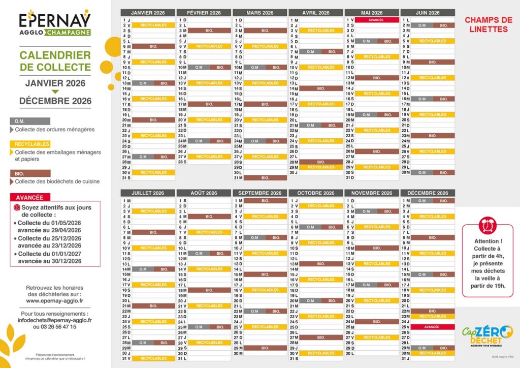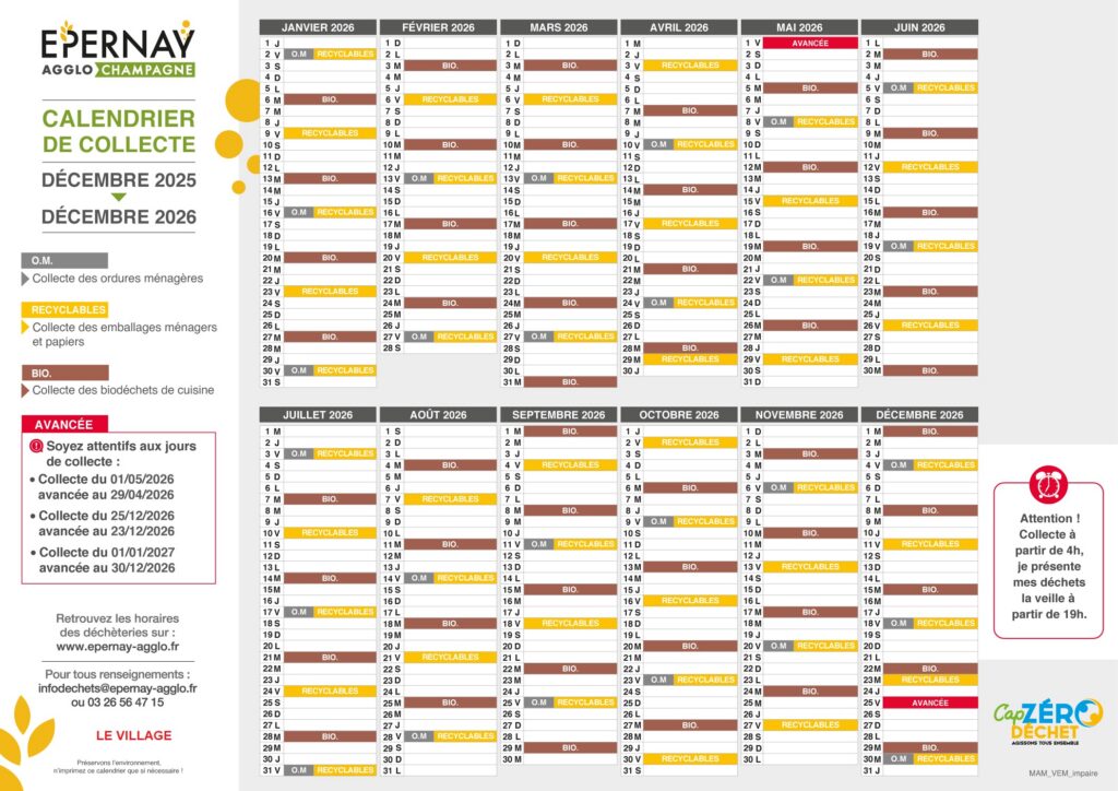 Voici les informations concernant les jours de collecte, en fonction de votre lieu d’habitation : https://epernay-agglo.fr/services-et-demarches/dechets/calendrier